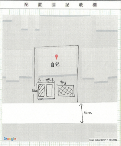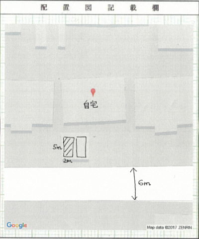 2017年当時は所在図・配置図の作成に便利なWebサービスを使用した結果、印刷後に手書きで書き足す必要がありました。そのため、下記の状態で所轄の警察署に提出しました。