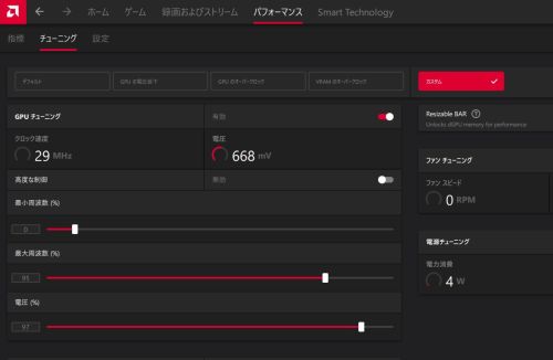 最大周波数を95%、電圧を97%に下げました。あんまり電圧を下げるとベンチマーク起動時にブラックアウトしますので、このくらいに調整しました。